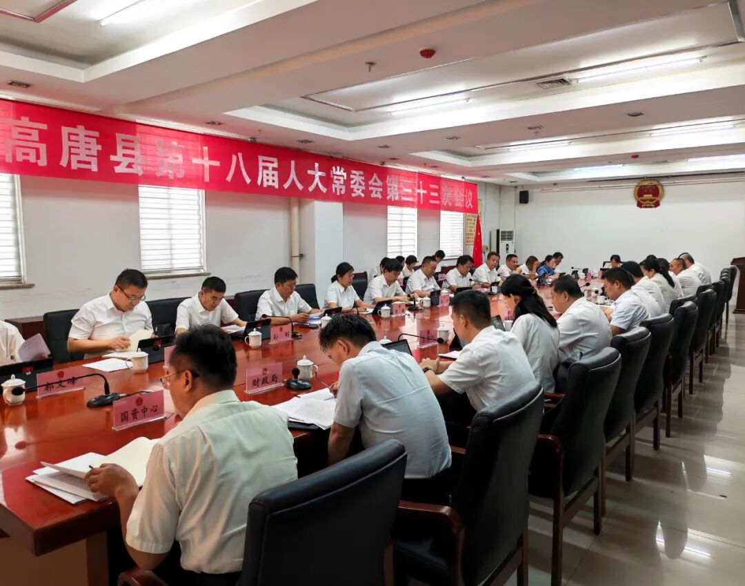 6月30日,高唐县第十八届人大常委会第三十三次会议召开。县人大常委会党组书记、主任陈广利主持会议。县人大常委会党组副书记、副主任孙海清,副主任常婕、徐林、邵东、郝林远及委员共26人出席会议。县委常委、纪委书记、监委主任赵福刚,县委常委、副县长梁彬,县人民法院院长孙刚,县人民检察院检察长郭霞,县政府相关部门负责人,县人大常委会机关各委室负责人,各镇街人大负责人列席会议。